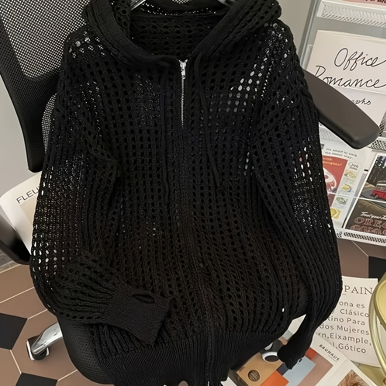 TEMU 여성용 가벼운 후드 카디건 - 통기성 오픈워크 스웨터, 여름용 루즈핏 여성 스웨터, 사무실 및 외출용, 해변용 - 부드럽고 신축성 있는 블랙 스웨터, 손세탁 쉬움, 캐주얼 아웃핏, 중간 신축성 원단