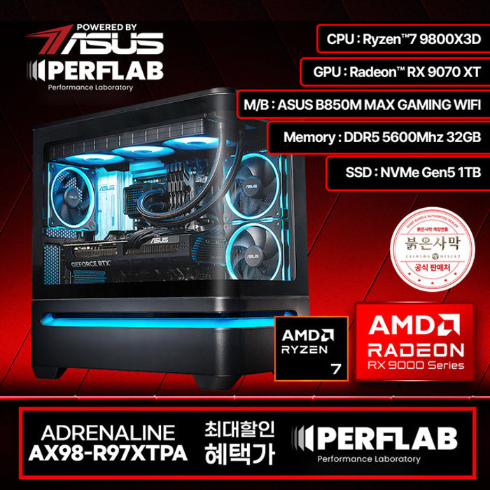 PERFLAB 어드레날린 AX98-R97XTPA Ryzen7 9800X3D RX 9070 XT 16GB 32GB 1TB 게이밍 데스크탑 조립 PC