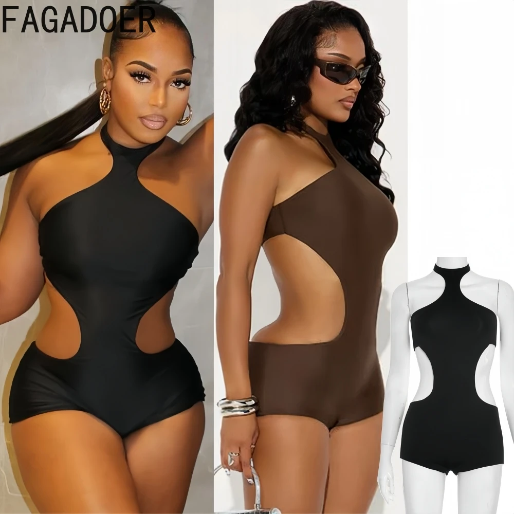 FAGADOER 여성용 섹시한 속이 빈 바디콘 롬퍼 홀터넥 민소매 백리스 원피스 점프수트 여성용 스트리트웨어 오버올 신상품