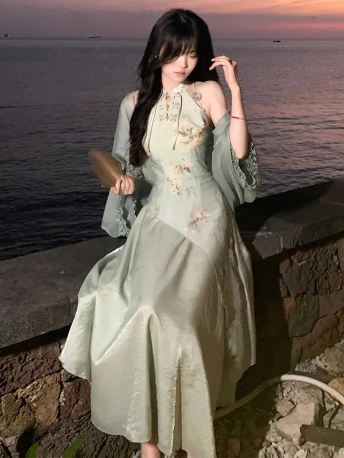우아한 녹색 민소매 넥 홀터 치파오 드레스 새로운 중국 스타일 하이 패션 봄 여름 여성 전통 의상