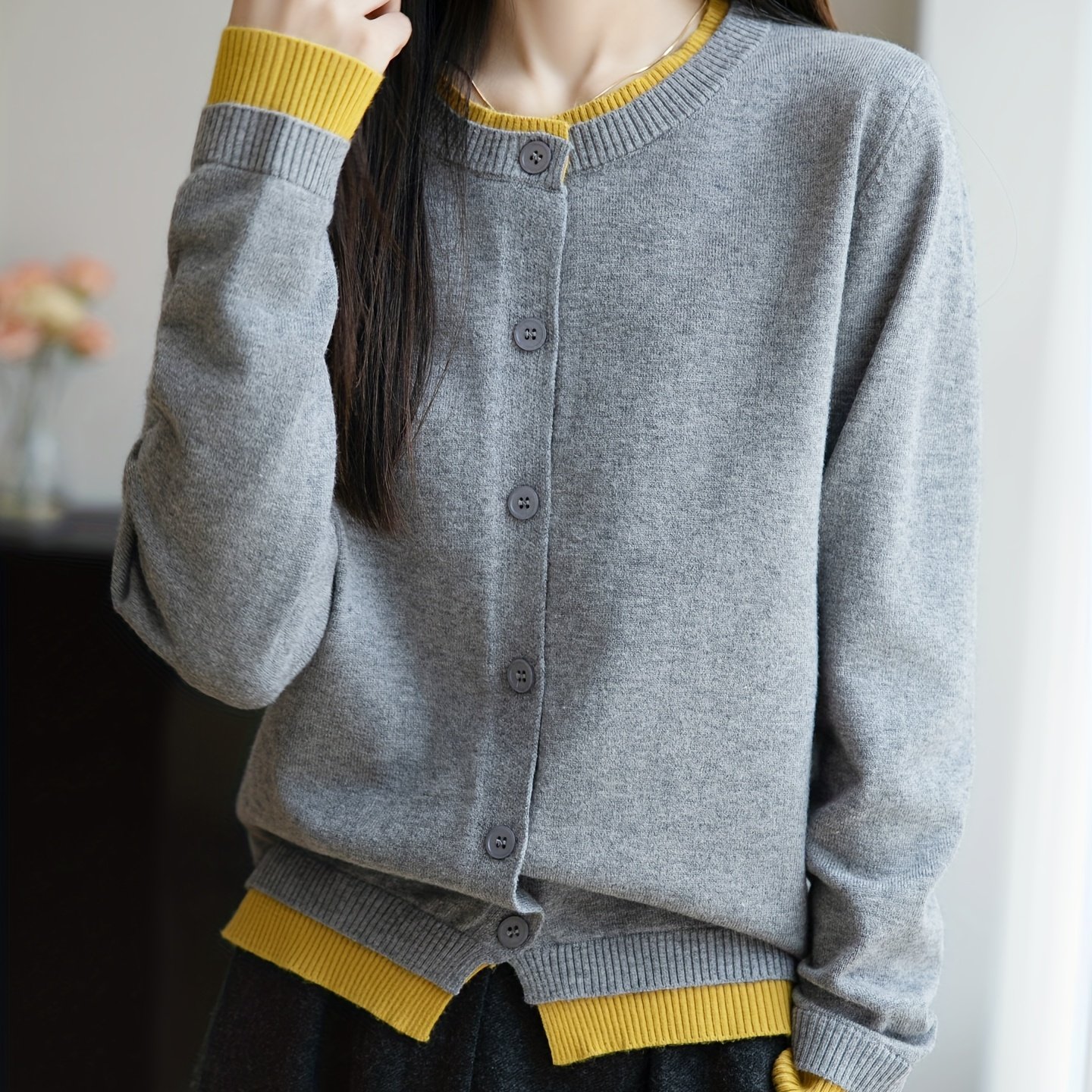 TEMU 여성용 두꺼운 가디건 - 옐로우 그레이 소매 & 블랙 버튼 프론트, 루즈핏 디자인, 컨트라스트 트림, 사계절 따뜻함, 우아한 사무실 & 캐주얼 시크, 출퇴근 의상, 레이어링 피스, 오버타임 패션, 편안한 착용감, 디테일