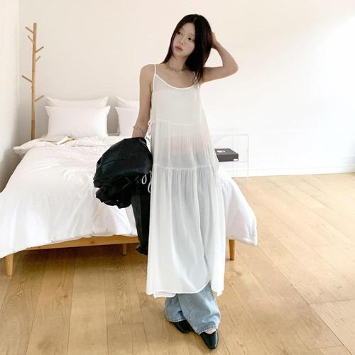 [디자이너몰]여성 봄 여름 언발 캉캉 끈나시 롱 원피스