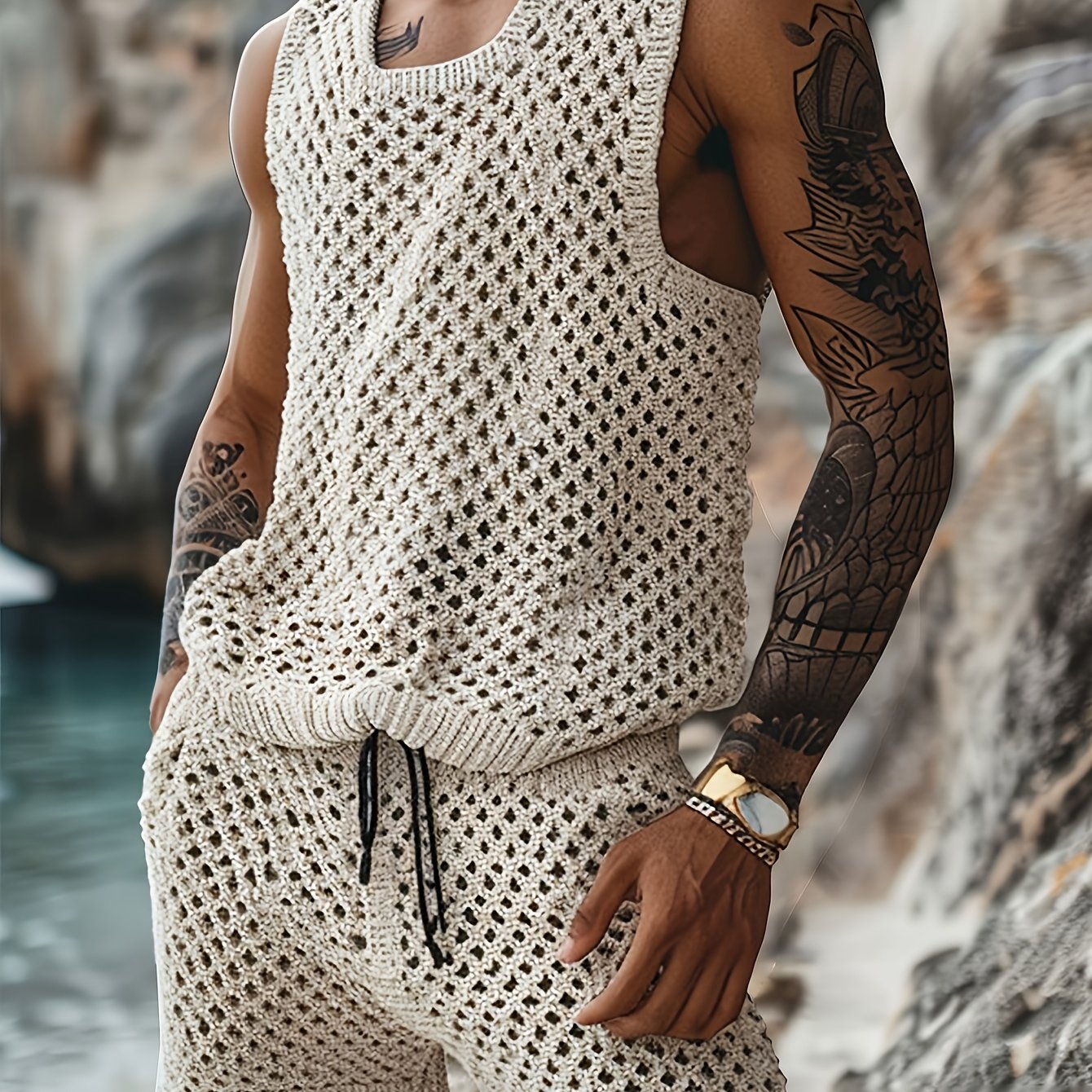 TEMU 남성 캐주얼 세미시어 세트. 크로셰 소재의 민소매 상의와 반바지로 구성되어 있습니다. 민소매 상의는 빈크로셰 기법으로 심플하고 편안한 분위기를 연출하며, 반바지는 드로스트링 디자인으로 편안하고 스타일리시합니다.