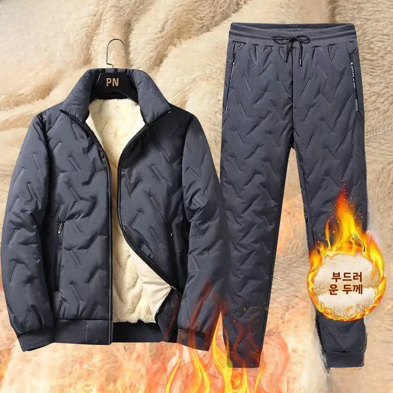 스타일리시 두꺼운 아빠 옷 면 재킷 남성용 겨울 다운 코튼 코트 양털 벨벳 따뜻한 방한 코튼 코트 및 바지 세트