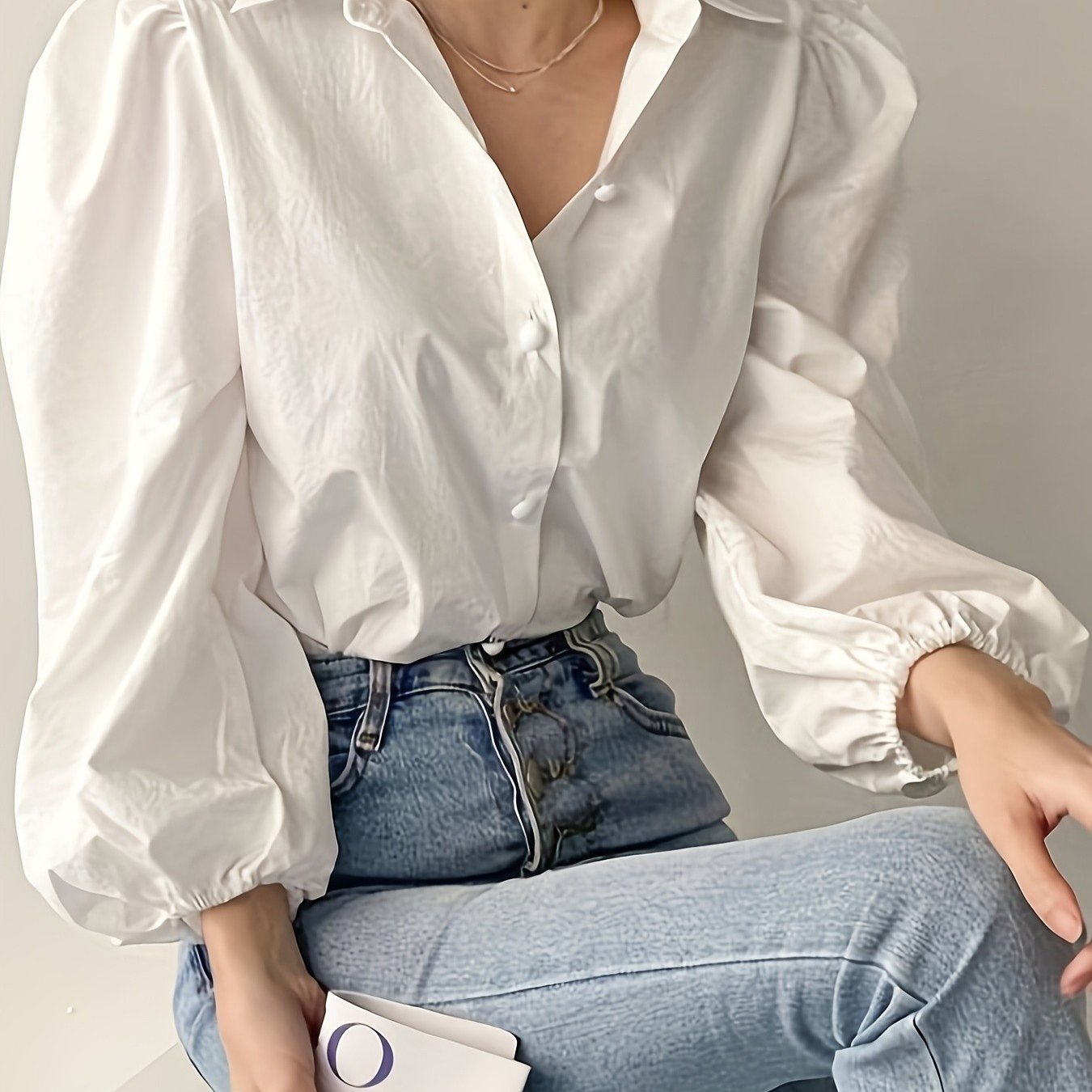 TEMU 프렌치 스타일 우아한 화이트 퍼프 소매 블라우스 - 숏 칼라 루즈핏 버튼 프론트 셔츠 재킷, 세탁기 사용 가능 봄 여름 가을 캐주얼 & 오피스 웨어, 다용도 레이어링 아이템 (No)|여름블라우스|반팔블라우스