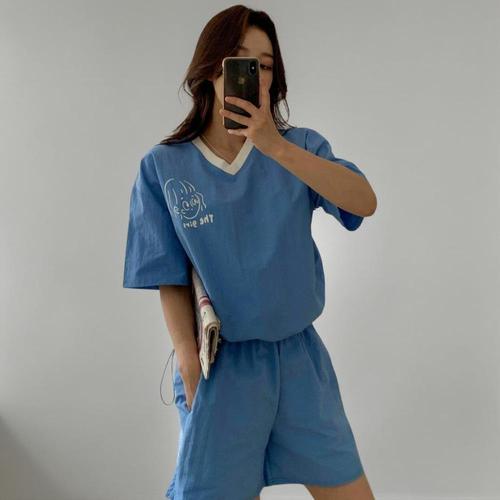 |KHD25E4|여성 브이넥 반팔티와 반바지 캐주얼 세트