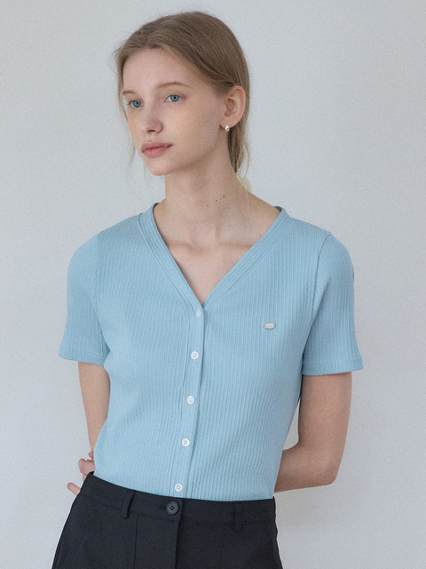 [아워호프] 브이넥 립브드 버튼업 티셔츠 - 스카이 블루