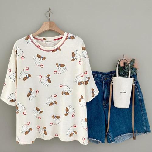 |KDT94C7|여자 캐주얼 강아지패턴 배색라인 루즈핏 반팔티