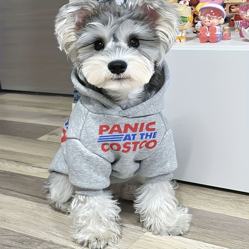 TEMU 소형 및 중형견용 후드 스웨트셔츠 - "팬릭 앳 더 코스토" 그래픽이 있는 두꺼운 따뜻한 풀오버, 회색 & 빨강/파랑 줄무늬, 슈나우저, 비숑, 테디를 위한 부드러운 원단, 봄/여름 의류