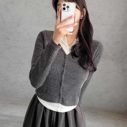 VANANA2 여성 깔끔핏 일체형 티셔츠 언발 단추 배색골지 사선 카라넥 롤업 셔츠 레이어드 니트 가디건 긴팔티