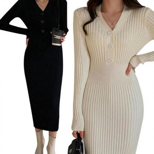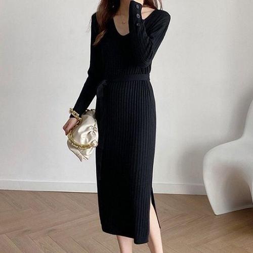 뜨개진 여성용 쫀쫀 뒷트임 브이 골지 쉐일리 롱 원피스
