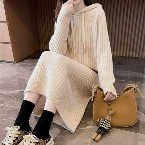 이쁘다요 넓은골지 후드 스웨터 긴팔 롱 니트 원피스 WFLMPWA