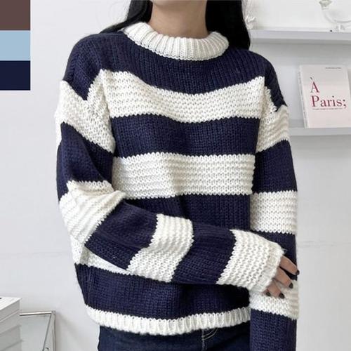 [다잇템]여자 스퀘어넥 굵은줄무늬 긴팔니트 티셔츠