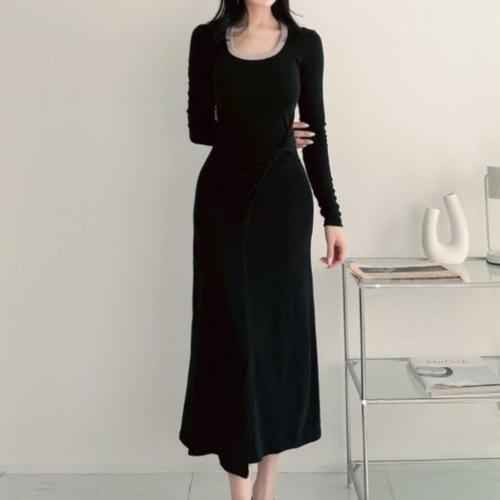 [옷자락]여성 배색 유넥 긴팔 트위스트 꼬임 롱 드레스