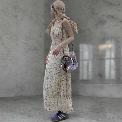 [다잇템]여성 스트랩 패턴 사랑스러운 꽃무늬 롱 드레스