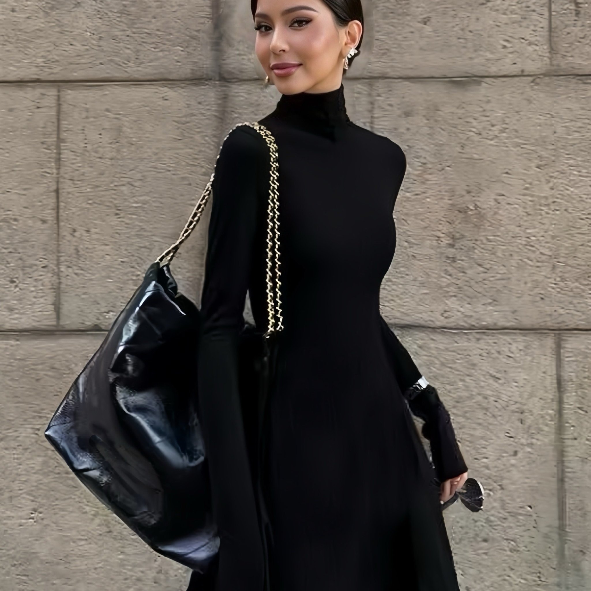 TEMU 여성용 하이넥 봄/가을 드레스, 우아한 허리핏, 무릎 길이 블랙 롱 드레스, 레이어링에 적합.|가을원피스