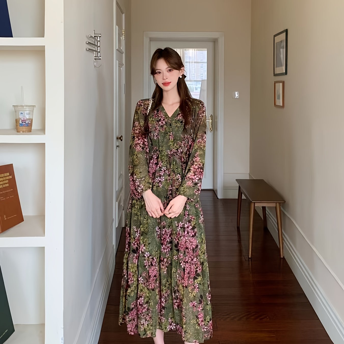 TEMU 새로운 V넥 무릎길이 시폰 맥시 드레스, 드로스트링 허리와 플로럴 프린트, 다용도 롱핏