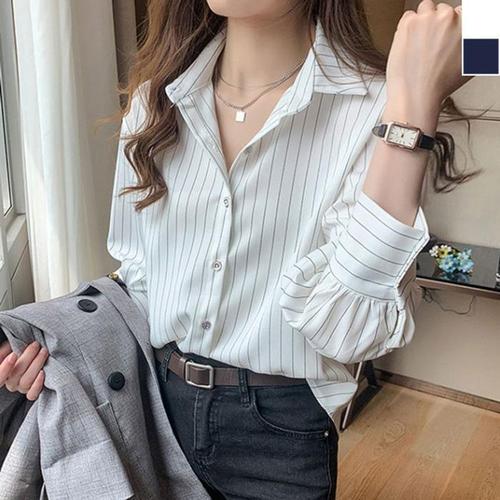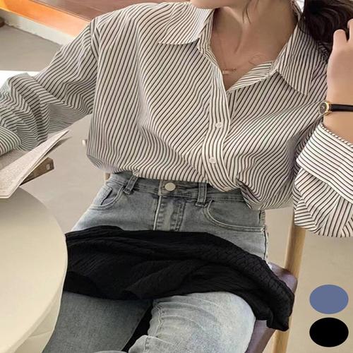 [위시드]스트라이프 사선 버튼 루즈핏 여성 셔츠 (WIACBL007)