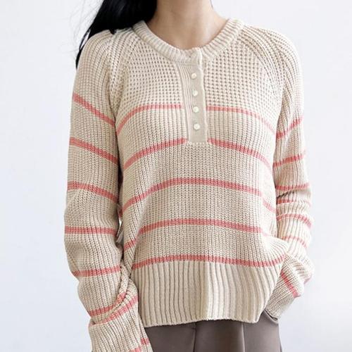 겨울 신상품 편안한 출퇴근용 배색 세로 줄무늬 디자인 단추 카라 빈티지 풀오버 긴팔 스웨트셔츠 여성용