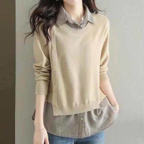 [오노마] ONM 셔츠 레이어드 니트탑 옆버튼 스트라이프 카라