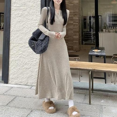 [깨비몰] 여성 단추 슬림 니트 롱 원피스 골지 롱치마