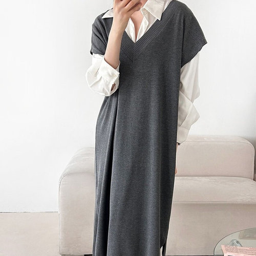 플러리싱 / 비스코스 브이넥 니트 나시 롱 원피스 플러리싱