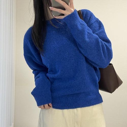 [옷자락]여자 백셔링 와인색 블루 솔리드 라운드넥 울 니트