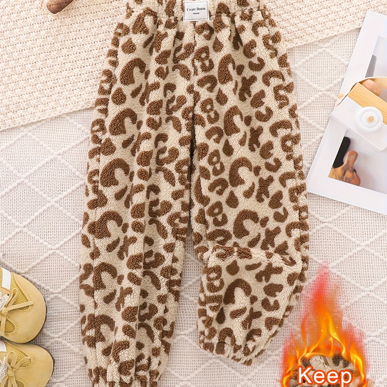 TEMU 여아 프린트 플리스 긴 바지 | 캐주얼 레귤러 핏, 논스트레치, 따뜻함, 빔팬츠 스타일, 탄성 허리 밴드, 야외 활동용
