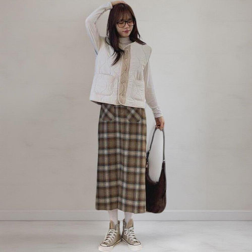 [다잇템] 여자 H라인 주머니 사선 격자 슬릿 겨울하객룩 롱스커트