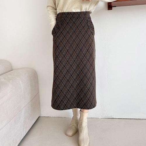 [옷자락] 여성 체크무늬 앞주머니 슬릿 H라인 롱 스커트