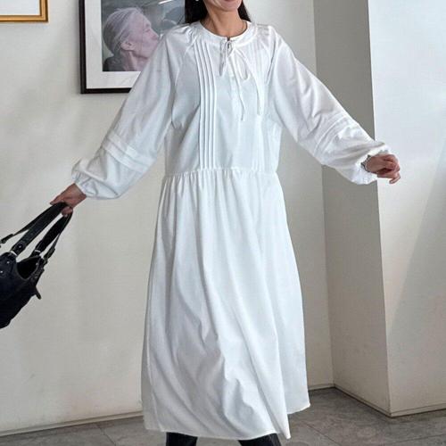 옷자락 / 여자 핀턱 리본 라운드넥 나그랑 박시핏 롱원피스