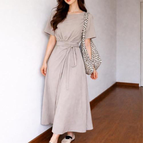 [옷자락]여자 반팔 라운드넥 허리 스트랩 슬림핏 롱원피스