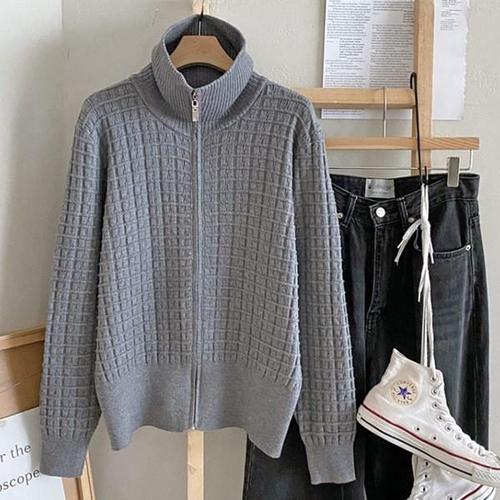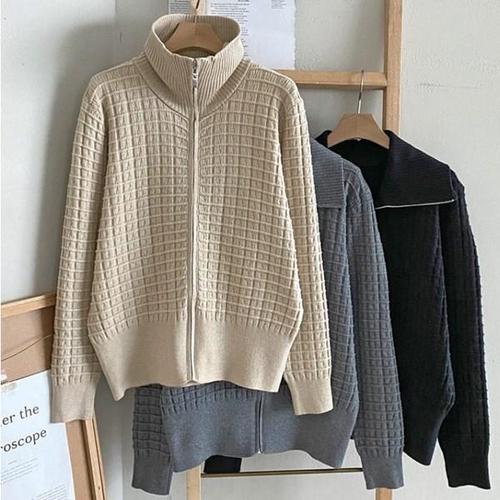 여자 레이온 빅카라넥 패턴 엠보 집업 가디건