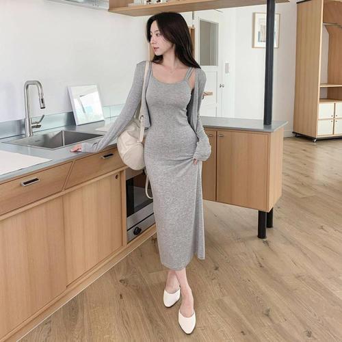 여성용 카디건 레이온 드레스 롱 슬림핏 세트