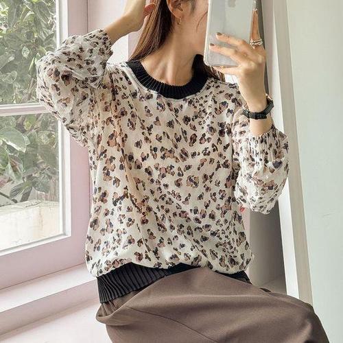 [다잇템][다잇템] 여성 아코디언 레오파드 FW U넥 롱슬리브 비침 블라우스_23103550_588872