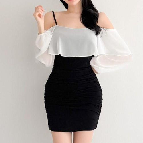 [옷자락]여성 시크룩 쉬폰 배색 오프숄더 셔링 미니 원피스