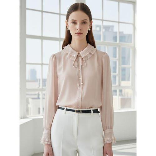 [신상오픈런]여성 루즈핏 시스루 레이스 리본넥 블라우스