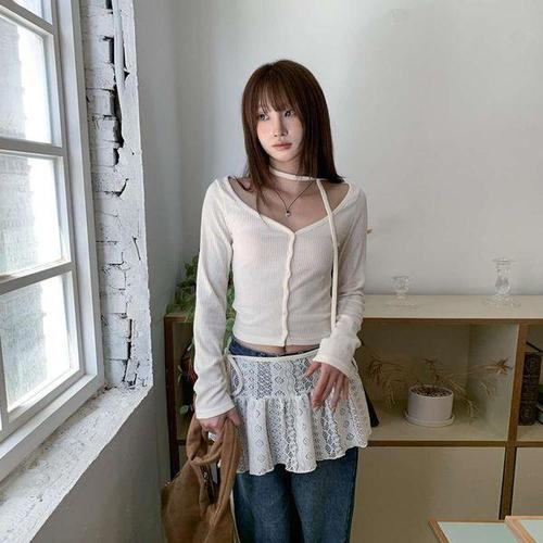[옷자락]여자 심플 레이온 골지 초커 스트랩 크롭 가디건