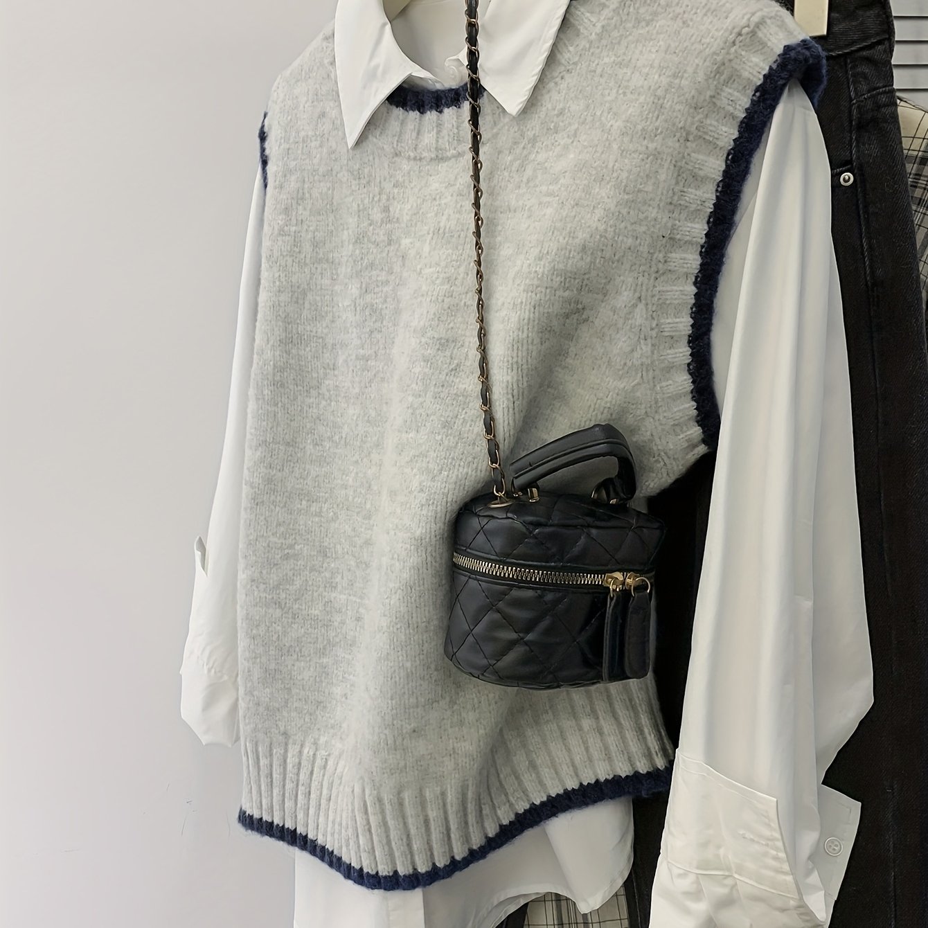 TEMU 여성용 조끼, 프레피 스타일 브이넥 케이블 조끼, 크롭 민소매 스웨터 조끼
