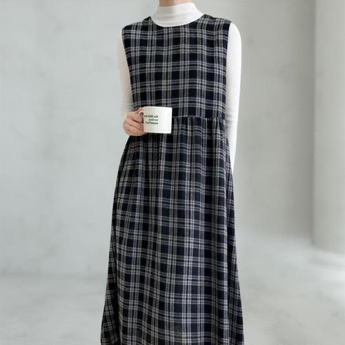 [옷자락] 여성 가을 패션 속기모 민소매 체크 롱드레스