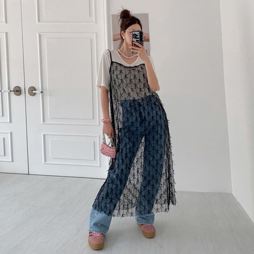 [원피스토리]망사꽃레이스 에이프런 나시원피스 시스루 레이어드 민소매 롱조끼 베스트