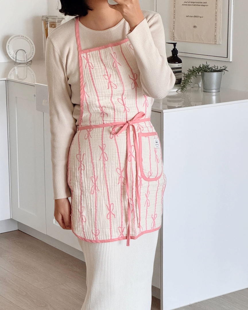 핑크 리본 앞치마 에이프런 양면 리버시블 하프 원피스 카페 공방