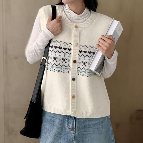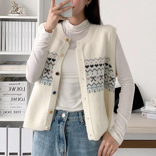 [다잇템]여성 귀여운 리본 스웨터 패턴 하트 박스 조끼