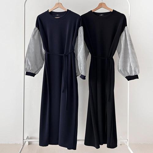 [옷자락]여성 스트라이프 퍼프 소매 배색 리본 롱드레스 빅사이즈
