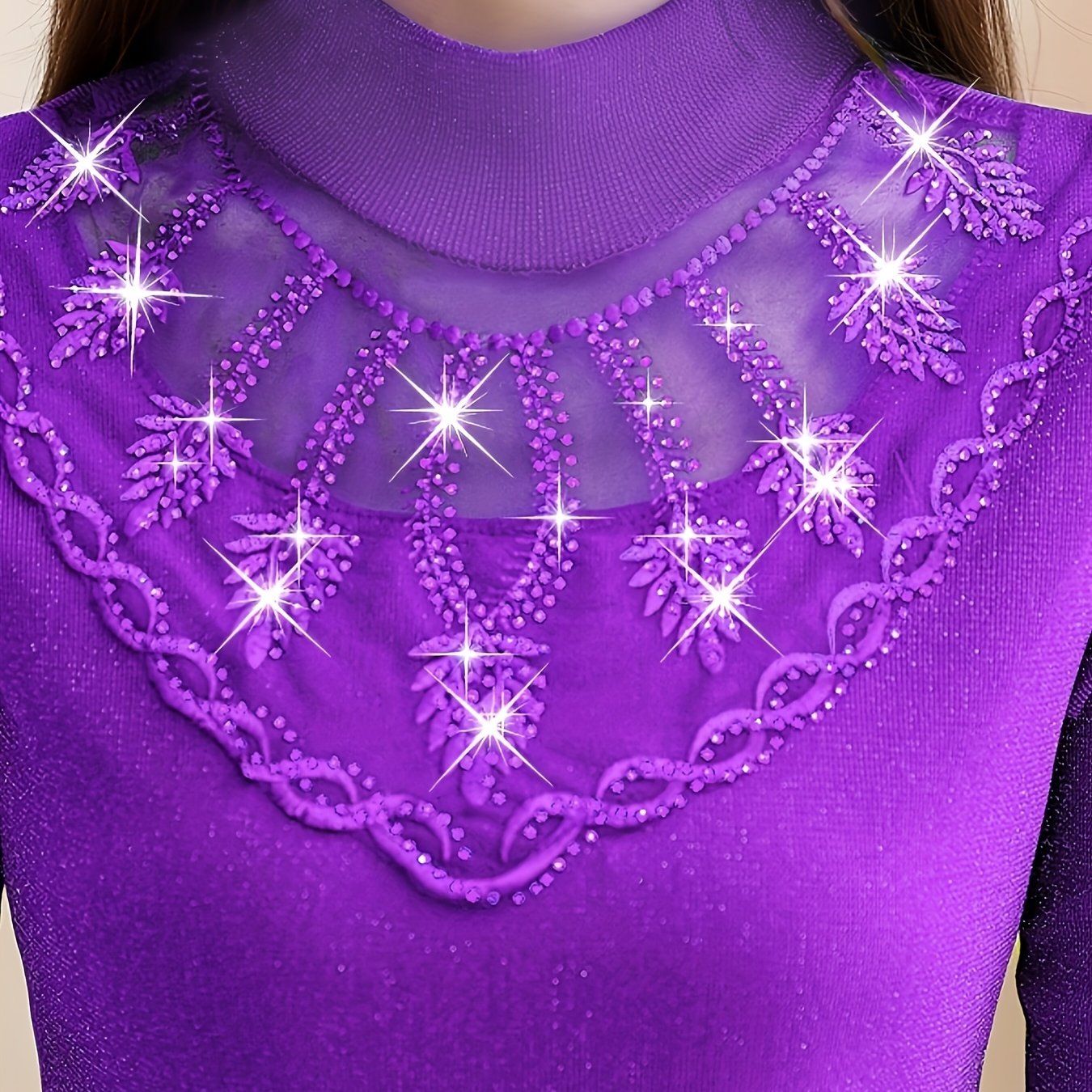 TEMU 여성 춘추 슬림 하이넥 스팽글 롤업 긴팔 이너망사 티셔츠 레이스 탑 봄 여름 가을 데일리 캐주얼 슬림핏 시스루 골지 망사 폴리에스테르 긴팔 티셔츠 얇은 댄스복상의|댄스복