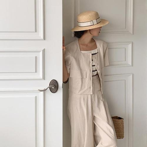 [옷자락]여자 스퀘어넥 린넨 크롭 셋업 반팔 자켓 밴딩 팬츠 세트