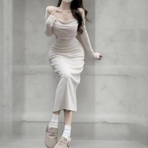 [에이치플러스몰]여성 슬림핏 A라인 롱원피스 긴팔 데일리 드레스