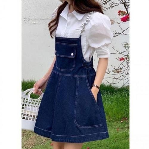 A라인 데님 미니원피스 오버롤 여자 포켓 멜빵 WFLMSKI