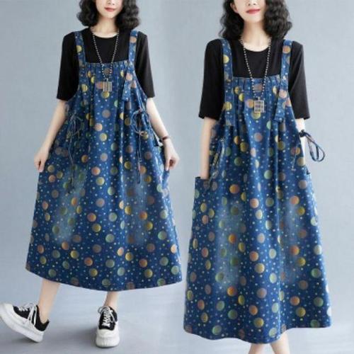 이쁘다요 프린팅 롱 청 점프 원피스 멜빵 데님 수트 WFLMPWW