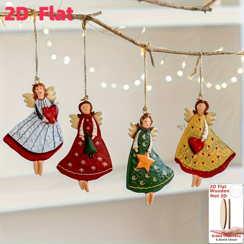 TEMU 2D 플랫 빈티지 천사 행잉 장식 4개 세트 - 판타지 테마 나무 크리스마스 트리 장식, 가벼운 축제 디자인, 전기 또는 배터리 불필요, 깃털 없는 빈티지 스타일 장식 2D 플랫 효과 목재 제품